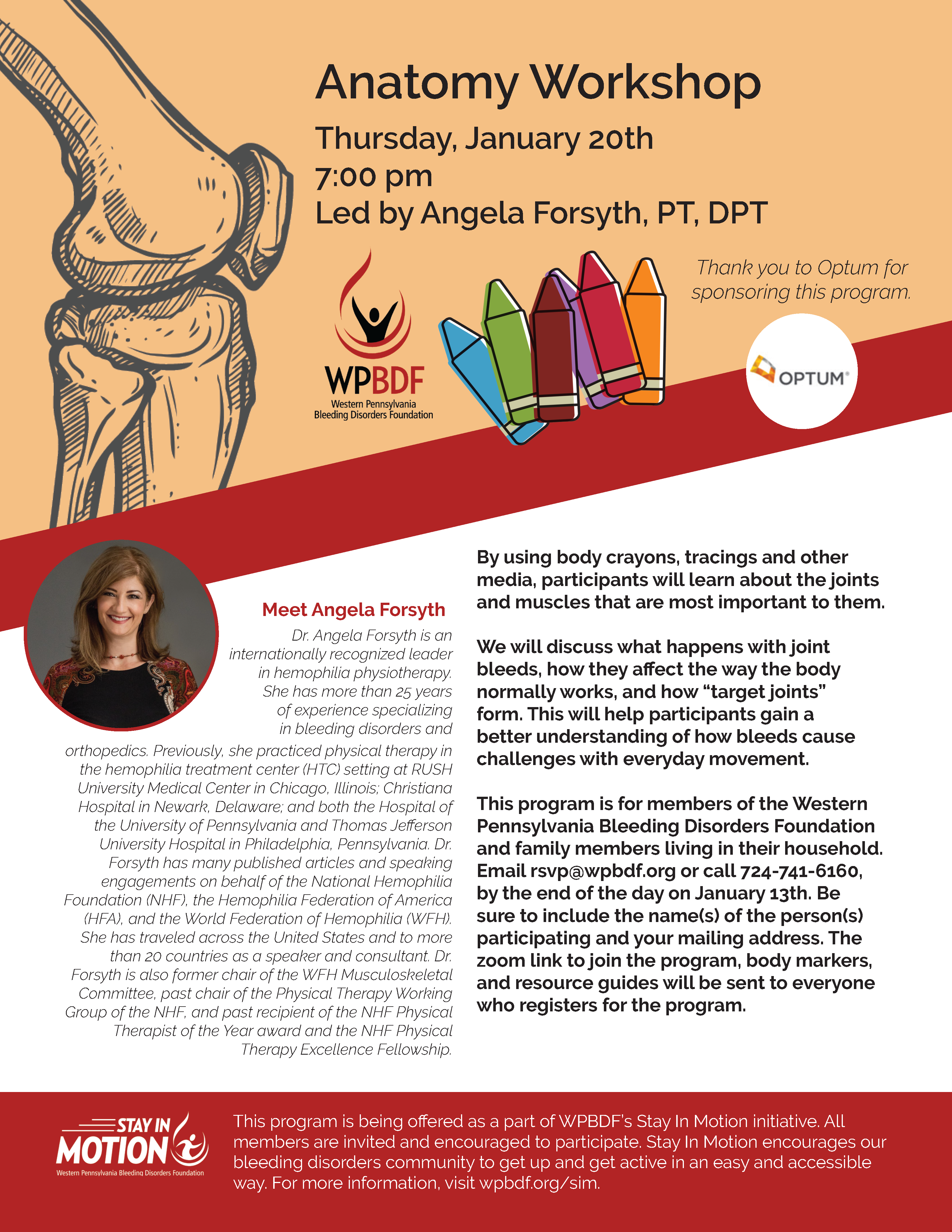This program is for members of the Western Pennsylvania Bleeding Disorders Foundation and family members living in their household. Email rsvp@wpbdf.org or call 724-741-6160, by the end of the day on January 13th.  Be sure to include the name(s) of the person(s) participating and your mailing address. Zoom link to join the program, body crayons, and resource guides will be sent to everyone who registers for the program.