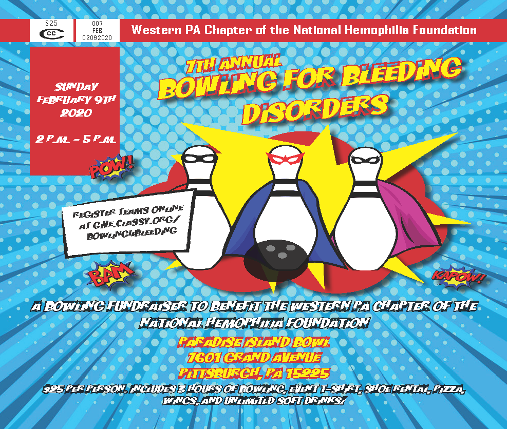 A bowling fundraiser to benefit the Western Pennsylvania Chapter of the National Hemophilia Foundation.
