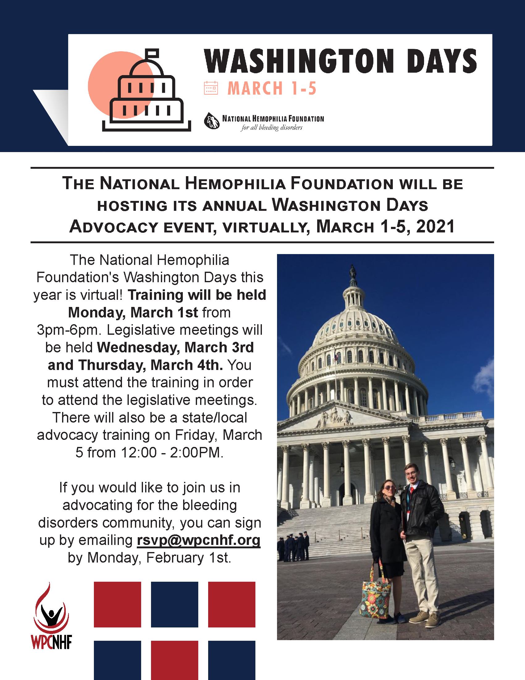 If you would like to join us in advocating for the bleeding disorders community, you can sign up by emailing rsvp@wpcnhf.org by Monday, February 1st.