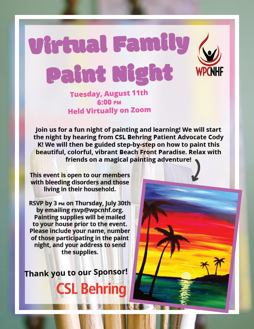 RSVP by Thursday, July 30th by emailing rsvp@wpcnhf.org with your name, number of those participating in the paint night, and your address to send the paint supplies. The Zoom link will be sent to those who register.