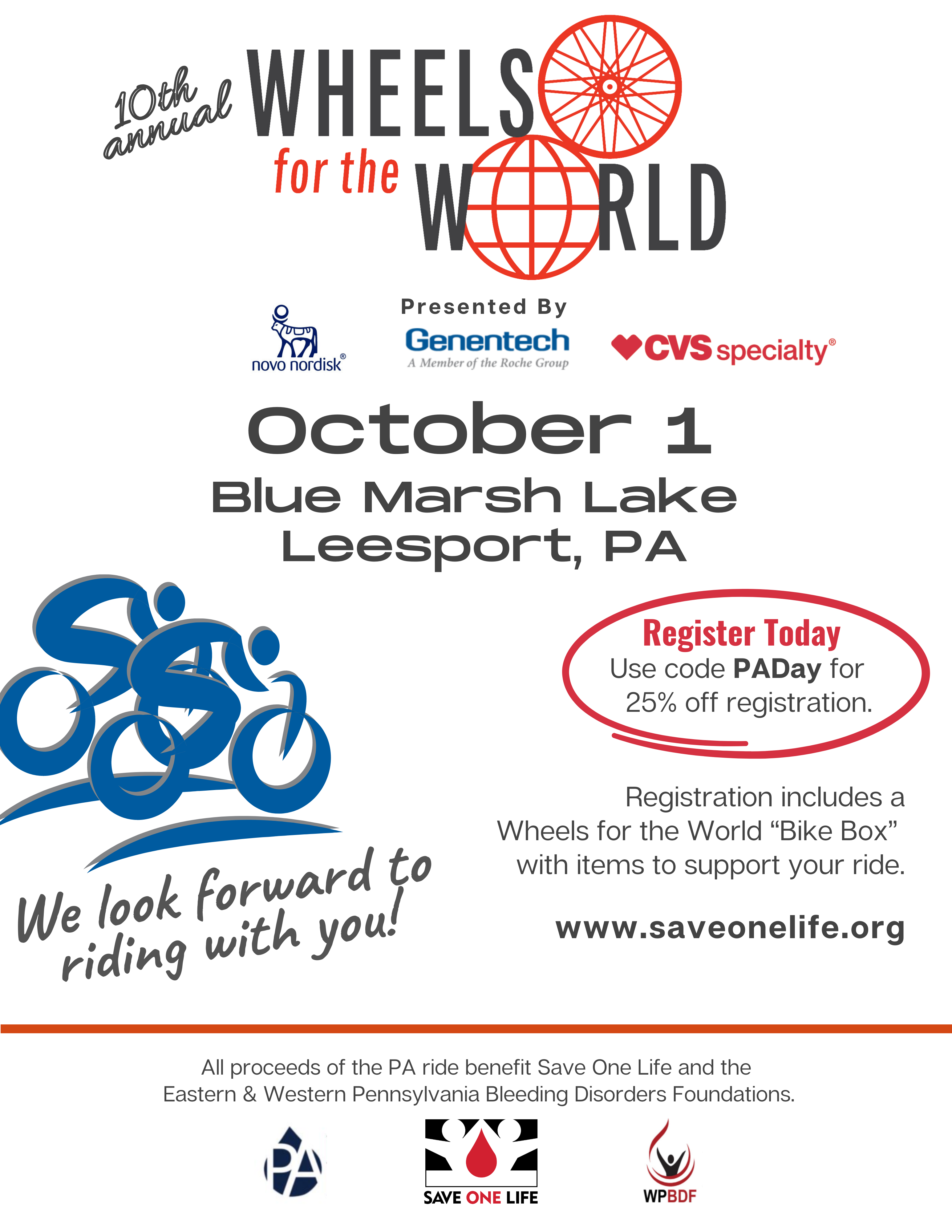You can participate in-person or virtually to have your fundraising efforts benefit Save One Life and the Eastern & Western Pennsylvania Bleeding Disorders Foundations.