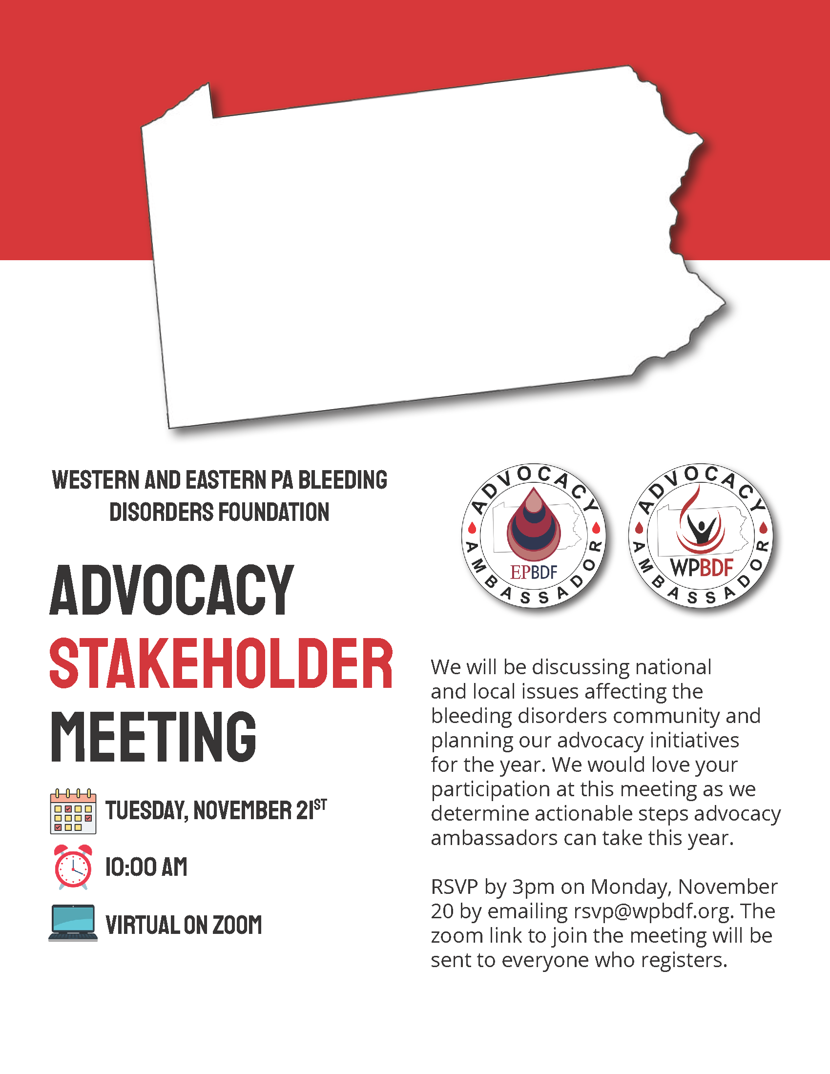 We are looking for individuals who are interested in supporting the advocacy efforts of the Pennsylvania Bleeding Disorders Foundations throughout the year. Do you have a desire to meet with legislators to help influence decisions on policies that affect individuals and families living with bleeding disorders? If you answered yes, we would like you to […]