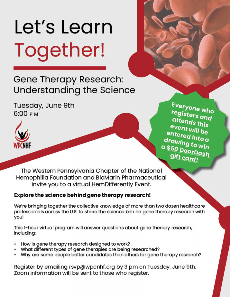 Register by emailing rsvp@wpcnhf.org by 3pm on Tuesday, June 9th. Please include your first and last name and Gene Therapy in the subject line.