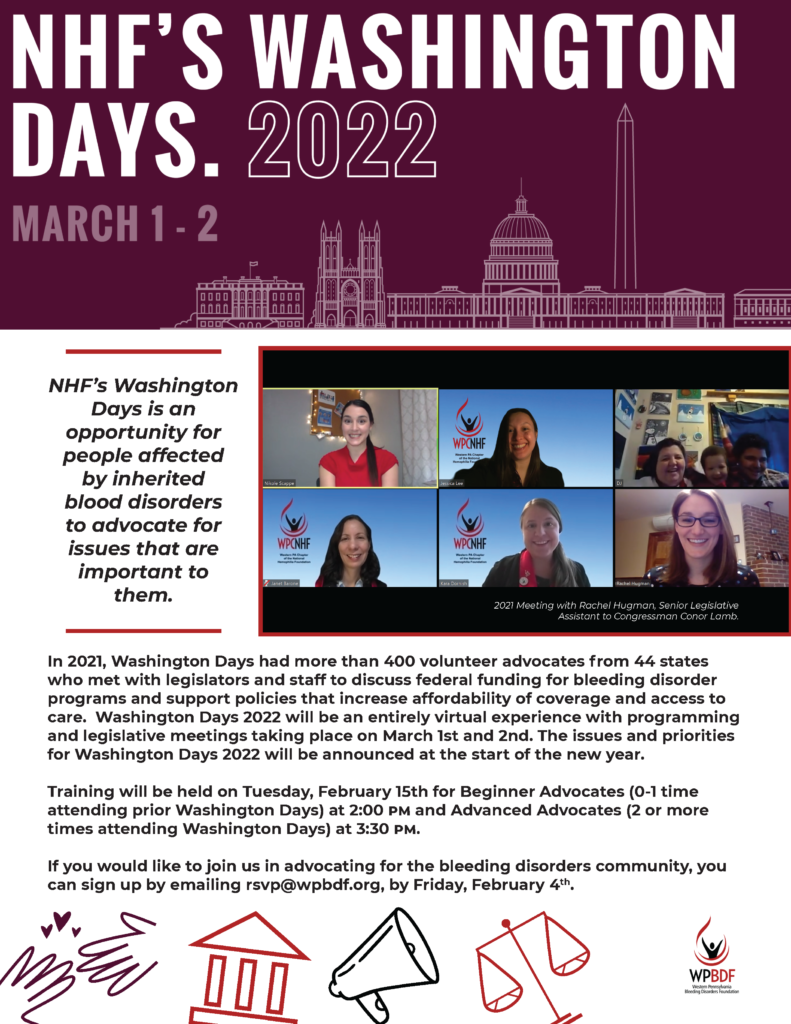 If you would like to participate in NHF’s Washington Days and join us in attending legislative meetings to advocate for the bleeding disorders community, please email us at rsvp@wpbdf.org, by Friday, February 4th.