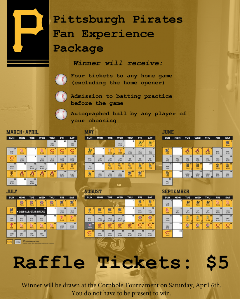 We are selling raffle tickets for a Pittsburgh Pirates Fan Experience Package! One lucky winner will receive: four tickets to any Pittsburgh Pirates home game of their choice (excluding the home opener), admission to batting practice before the game, and an autographed ball by any Pirates player of their choosing.