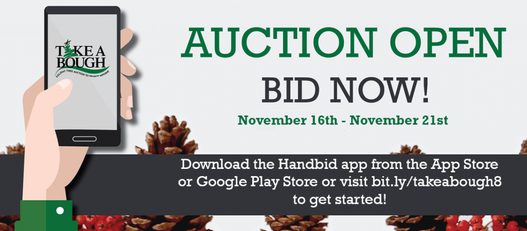 Be sure to download the Handbid mobile app on the Apple App Store or the Google Play Store to get real time updates on your bidding! On the app, search “8th Annual Take A Bough,” sort from A-Z, and it will pop up. Happy bidding!