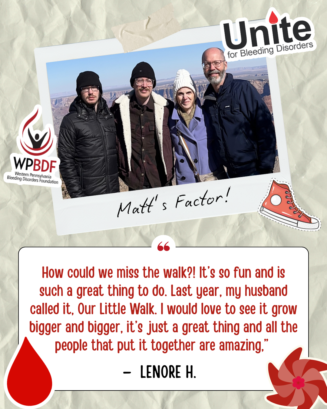 “How could we miss the walk?! It’s so fun and is such a great thing to do. Last year, my husband called it, Our Little Walk. I would love to see it grow bigger and bigger, it’s just a great thing and all the people that put it together are amazing,” Lenore said. “Any chance we have to reach out to the broader community and help them understand what it’s like to live with a bleeding disorder is incredibly valuable.”